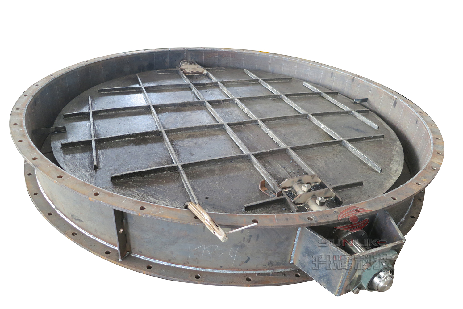 圖為加工完成后的電動蝶閥在油漆車間噴漆,藍色圓框部分是安裝電動執(zhí)行器的底座部分。