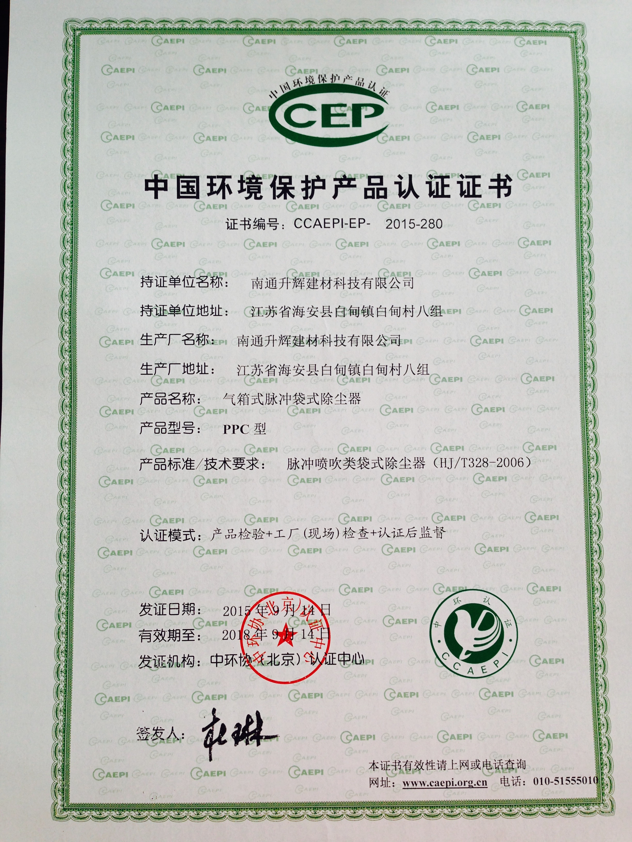 升輝產(chǎn)品氣箱式脈沖袋式除塵器獲中國環(huán)境保護產(chǎn)品認證證書