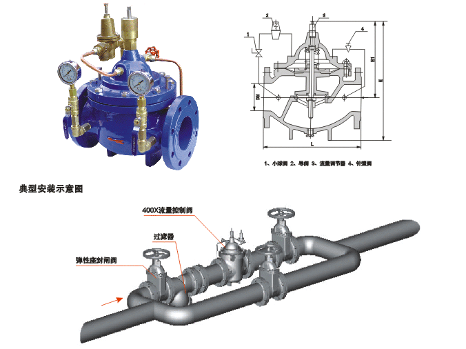 400X流量控制閥是一種采用高精度先導(dǎo)方式控制流量的多功能閥門。 當閥門從進口端給水時,水流過針閥進入主閥控制室,并經(jīng)過導(dǎo)閥、球閥流出主閥控制室到出口,此時主閥處于全開或浮動狀態(tài)。調(diào)定主閥上部的流量調(diào)節(jié)閥,可為主閥設(shè)定一定開度。調(diào)節(jié)針閥開度和調(diào)節(jié)導(dǎo)閥彈簧壓力,即可使主閥開度保持在設(shè)定開度,并在壓力變化時導(dǎo)閥進行自動調(diào)節(jié),保持流量不變。該系列流量控制閥適用于配水管需控制流量和壓力的管路中,保持預(yù)定流量不變,將過大流量限制在一個預(yù)定值,并將上游高壓適當減低,即使主閥上游的壓力發(fā)生變化,也不會影響主閥下游的流量。
