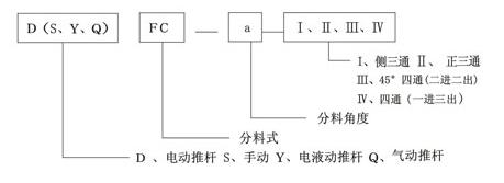 DFC電動(手動、電液動與氣動)三通分料閥分為Ⅰ、Ⅱ型,均帶導向板,Ⅰ型為側(cè)三通分料閥,Ⅱ型為正三通分料閥,四通分料閥分為Ⅲ、Ⅳ型,均帶導向板,Ⅲ型為二進二出,Ⅳ型為一進三出。