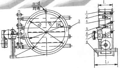 1.閥體 2.百葉板 3.閥軸 4.連桿 5.連桿軸 6.曲柄 7.伯納德執(zhí)行器 8.支架 ZKVb-0.05型電動(dòng)百葉圓式閥(配用伯納德執(zhí)行器)